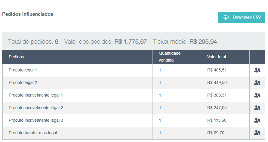 Pedidos influenciados mostra quais produtos foram comprados?